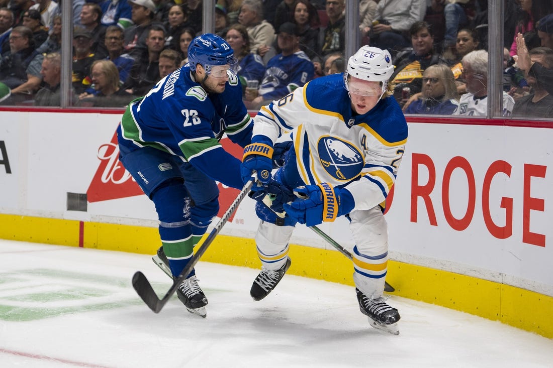 Sabres defenseman Mattias Samuelsson left the game early in the second period with a lower-body injury after getting tangled with Canucks forward Curtis Lazar in the corner.