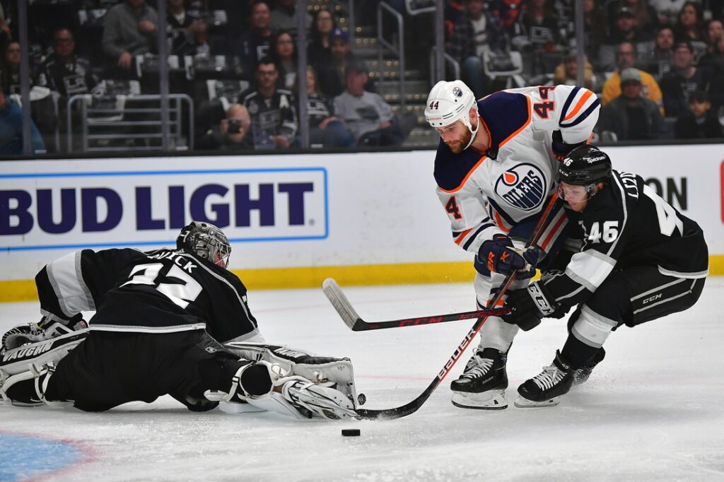 Jonathan Quick collected his 10th career playoff shutout and the host Los Angeles Kings rode a pair of first-period goals by Trevor Moore and Troy Stecher to a 4-0 victory over the Edmonton Oilers on Sunday in Game 4 of their Western Conference opening-round series.